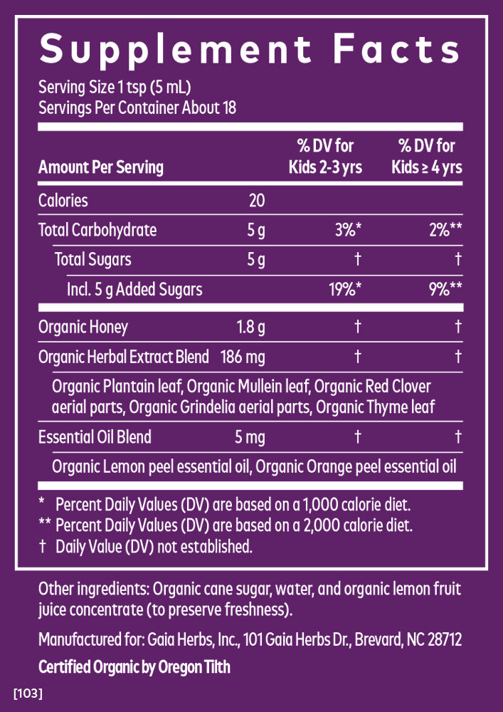 Organic Honey, Organic Herbal Extract Blend: Organic Honey, Organic Plantain leaf, Organic Mullein leaf, Organic Red Clover aerial parts, Organic Grindelia aerial parts, Organic Thyme leaf. Essential Oil Blend: Organic Lemon peel essential oil, Organic Orange peel essential oil, organic cane sugar, water, and organic lemon fruit juice concentrate (to preserve freshness).